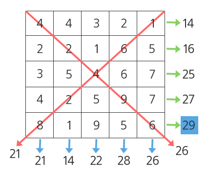 대각선의 합을 구하기 위해서는 행과 열의 관계를 잘 생각해보면 된다.