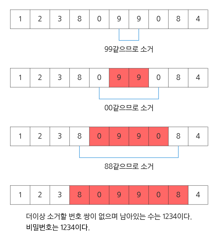 0~9로 이루어진 번호 문자열에서 같은 번호로 붙어있는 쌍들을 소거하고 남은 번호를 비밀번호로 만드는 것입니다.