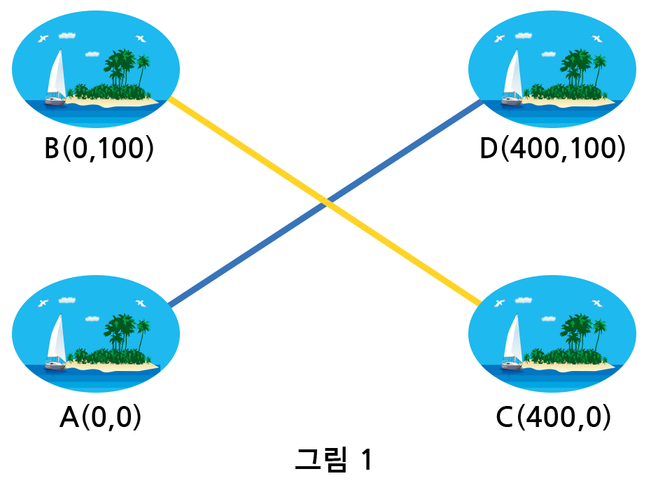해저터널은 반드시 두 섬을 선분으로 연결하며, 두 해저 터널이 교차된다 하더라도 물리적으로는 연결되지 않는 것으로 가정합니다.