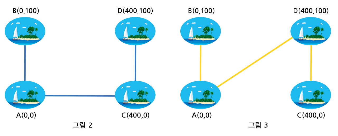 위의 그림 2는 환경 부담금을 최소로 하며 모든 섬을 연결하고 있지만, 그림 3은 그렇지 않음을 알 수 있습니다.