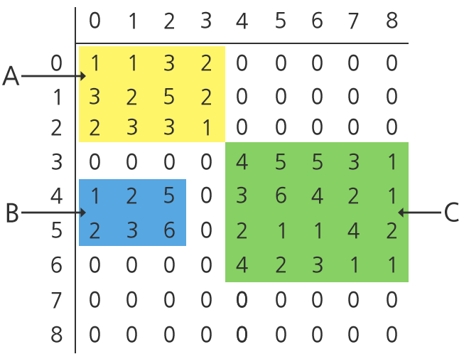 예를 들어, 위의 그림에서 A와 B 사이와 B와 C 사이를 보면, 빈 용기를 나타내는 ‘0’ 원소들이 2개의 사각형 사이에 있는 것을 알 수 있다.