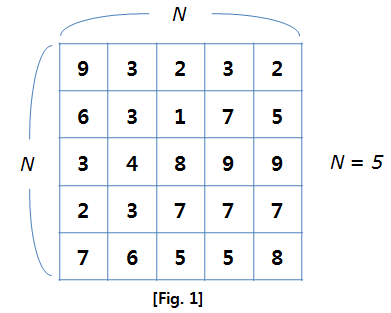 등산로 부지는 아래 [Fig. 1]과 같이 숫자가 표시된 지도로 주어지며, 각 숫자는 지형의 높이를 나타낸다.