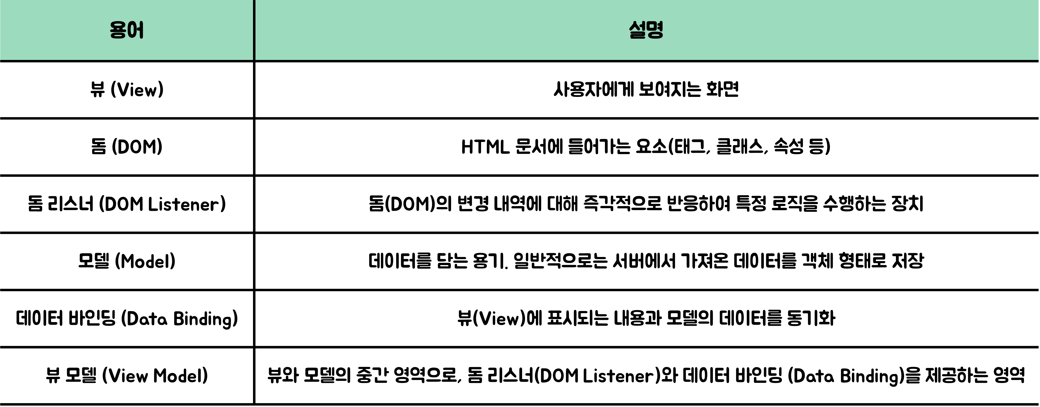 - 양방향 데이터 바인딩 : 화면에 표시되는 값과 프레임워크 모델 데이터 값이 동기화되어 한쪽이 변경되면 다른 한쪽도 자동으로 변경된다.